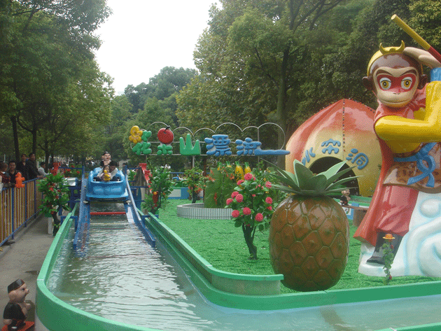 花果山漂流是一種新型兒童水上游樂設備,"內有“花果山”,有簡直跟《西游記》里描寫的水簾洞一模一樣的桃形“水簾洞”,還有“孫悟空”塑像。“花果山漂流”內還有香蕉、蘋果和蜜桃三大水果景點。兒童可邊漂流邊按電鈕玩游戲,只要打中目標的靶心,就會出現相關場景。少年兒童劃著船穿過“水簾洞”,順著一座小橋滑下,激起一片歡樂的浪花,假若打中假山,假山會噴水;假若打中巨型香蕉下的豬八戒,豬八戒會上下跳動;假若打中孫悟空,孫悟空會騰云駕霧大鬧天宮。